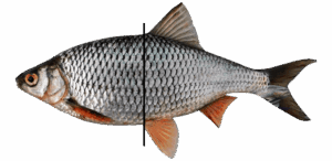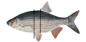 | Rotauge | Der Ansatz der Rückenflosse steht etwa auf gleicher Höhe wie der Ansatz der Bauchflosse | ![]() |
