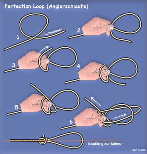 Der Knoten erzeugt eine Schlaufe, die in einer Linie mit der Schnur liegt.